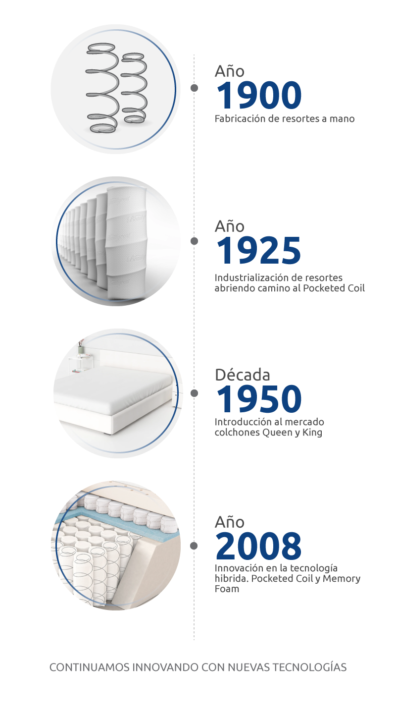 Fuimos la primera compañía de colchones que introdujo el tamaño king y queen en la década de los 50's. Además, en 2008 inventamos una tecnología híbrida que fusiona el memory foam con la tecnología de resortes Pocketed Coil, dejando atrás al resto de marcas en la industria.